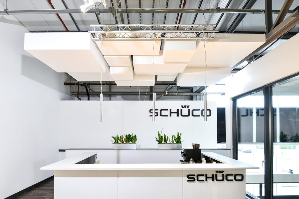 Earlier this year, we were contracted to work on the Schüco UK showrooms. We worked in collaboration with OWA, who designed the layout and provided the products for us to fit. The Schüco UK showroom is a versatile space for events and product displays. However, concerns arose regarding the acoustics, particularly echoing sounds that hindered clear communication. To address this challenge, we helped to devise and provide a solution in collaboration with OWA UK. The result was some stylish and functional acoustic solutions.