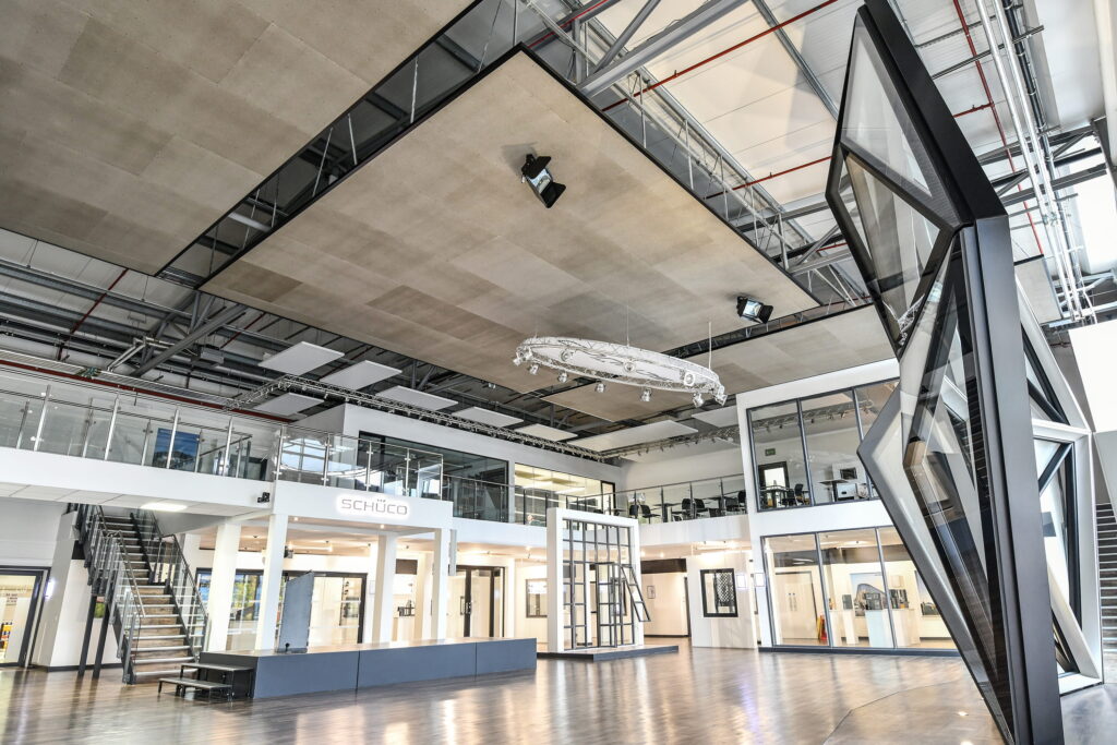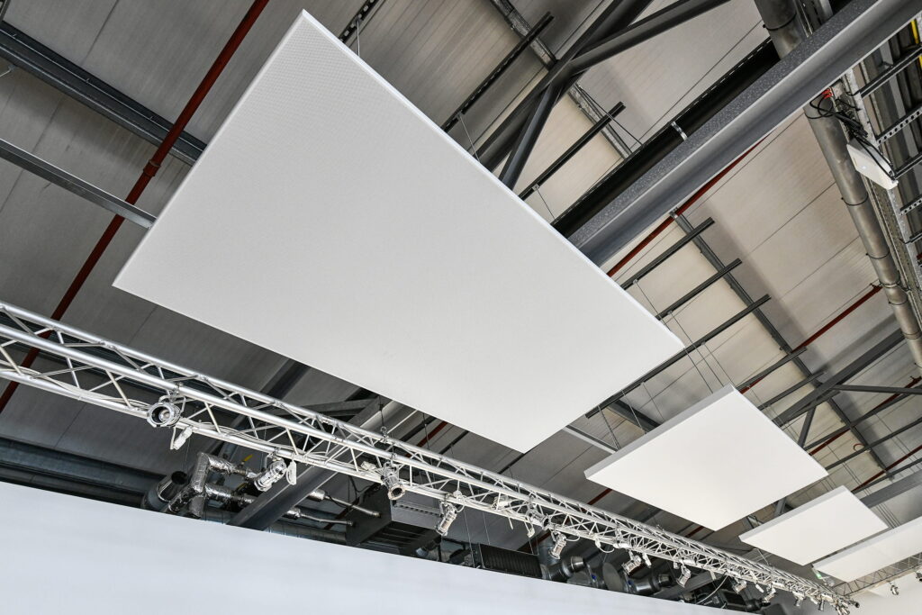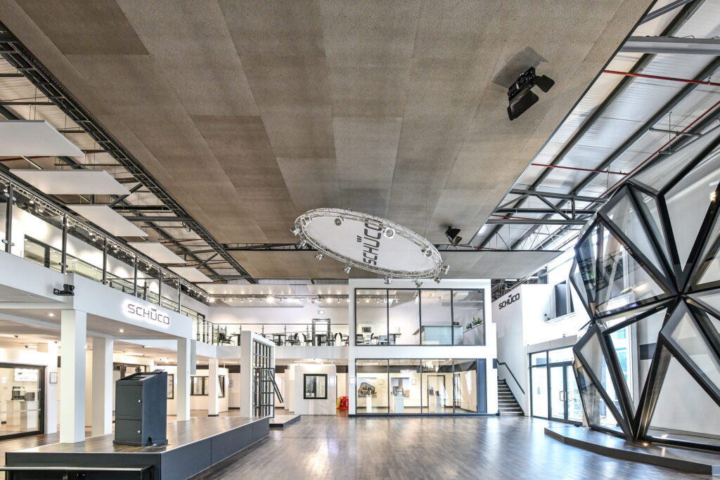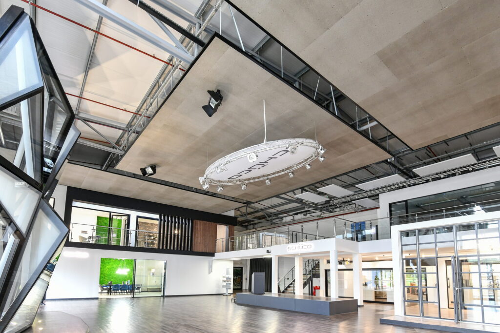 Working closely with OWA and the team at Schüco UK, a tailored solution was implemented to reduce the noise level and echo during events in the showroom. The introduction of acoustic ceiling canopies not only improved sound clarity but also seamlessly blended with the showroom’s sophisticated interior.