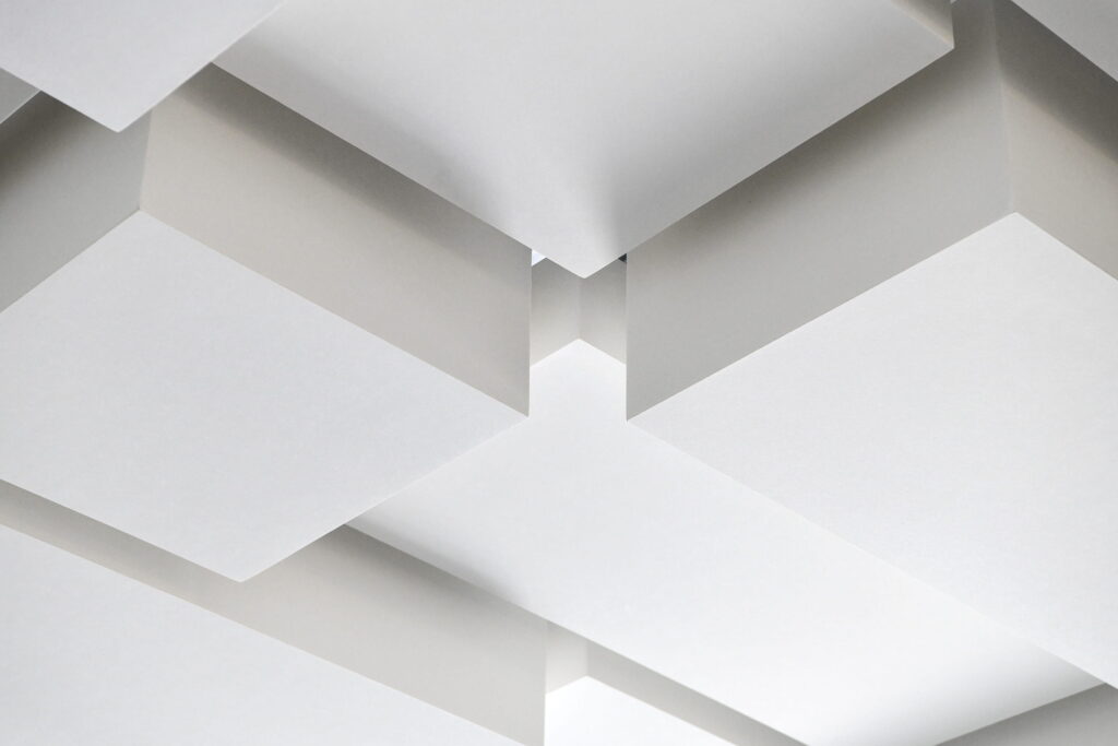 Above the bar area, we installed OWAconsult Corpus cuboid shapes, which not only provided acoustic absorption but also looked stylish and in keeping with the overall style of the showroom. These versatile acoustic boxes offer flexibility in layout, contributing to the showroom’s unique ambience.